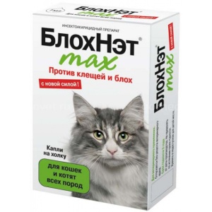 БлохНэт max эффективно действует против внешних паразитов на всех стадиях их развития (яйца, личинок, взрослых особей). Препарат уничтожает: блох, вшей, власоедов, личинок и имаго иксодовых и саркоптоидных клещей, обладает репеллентным действием против кровососущих комаров.